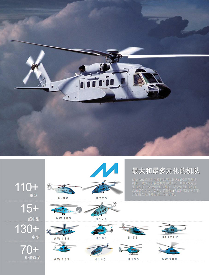 Milestone航空集團擁有世界上最大的民用直升機機隊,其旗下機隊總數達300余架,其中72%為重型直升機,22%為中型直升機,6%為輕型直升機,品牌涵蓋空客、貝爾、萊昂納多和西科斯基等主要廠家的全新直升機和二手直升機。公司主要業務聚焦石油和天然氣平臺運輸、搜索和救援、緊急醫療服務、消防和公用事業任務以及商務運輸等直升機租賃市場,客戶涉及全球主要的運營商,其中包括CHC Helicopter、 Bristow Helicopters、 Saudi Aramco、Babcock International、PHI公司及中國的中信海洋直升機有限公司、南航通用航空有限公司、中國通用航空有限公司等。